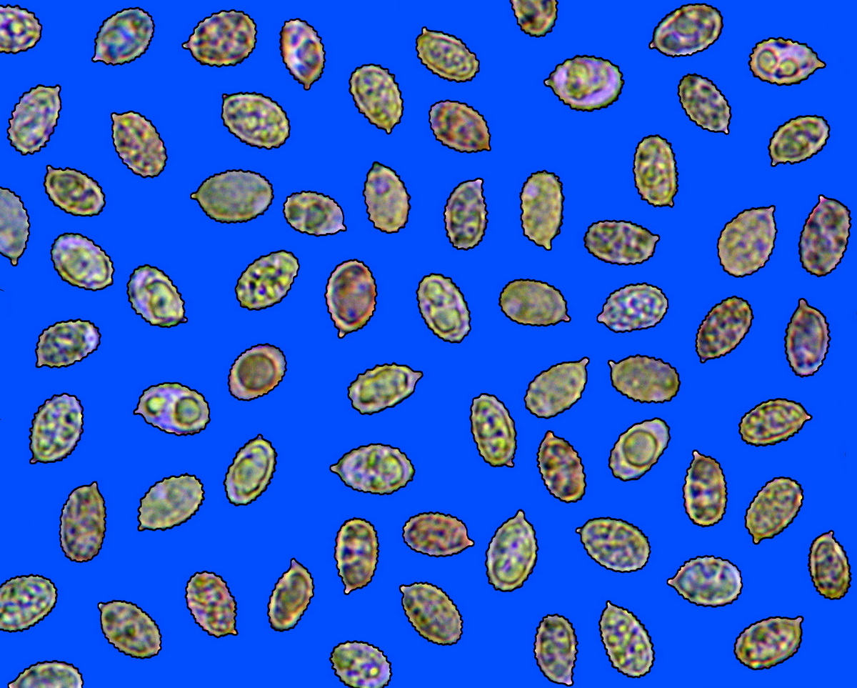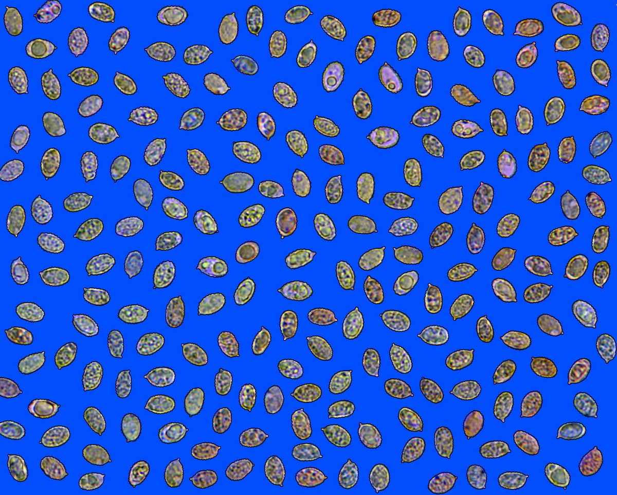 ellissoidali, finemente verrucose, amiloidi, (7,82)8,14-8,675-9,37(9,91)