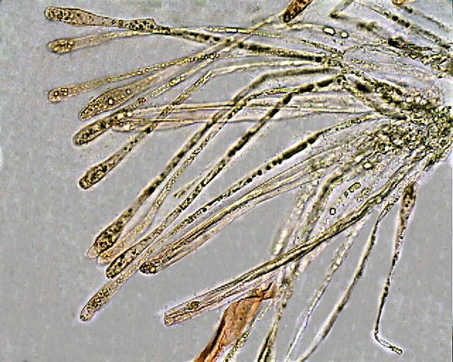 cilindriche, più lunghe degli aschi,settate, con apice