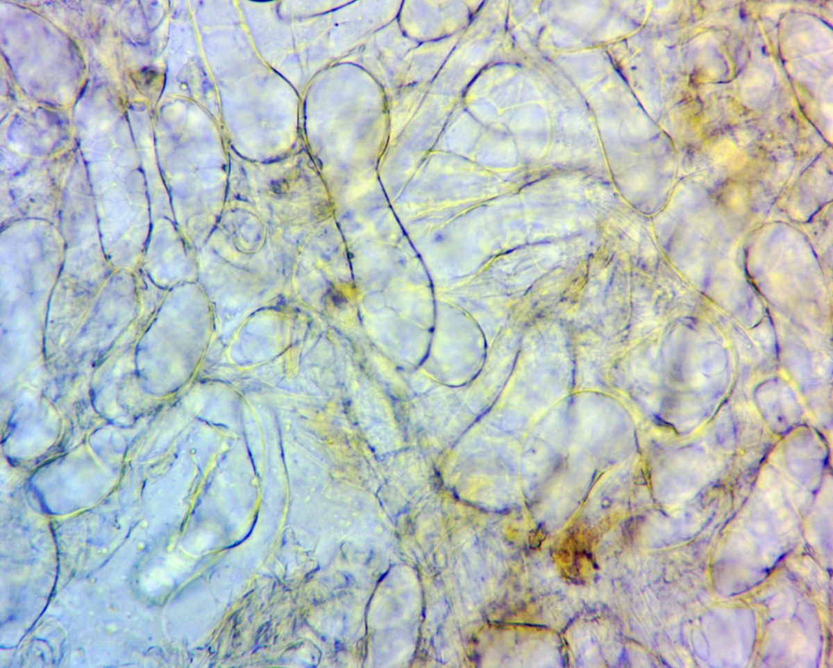 lacunoso, furfuraceo, biancastro con sfumature rosate-rossastre.