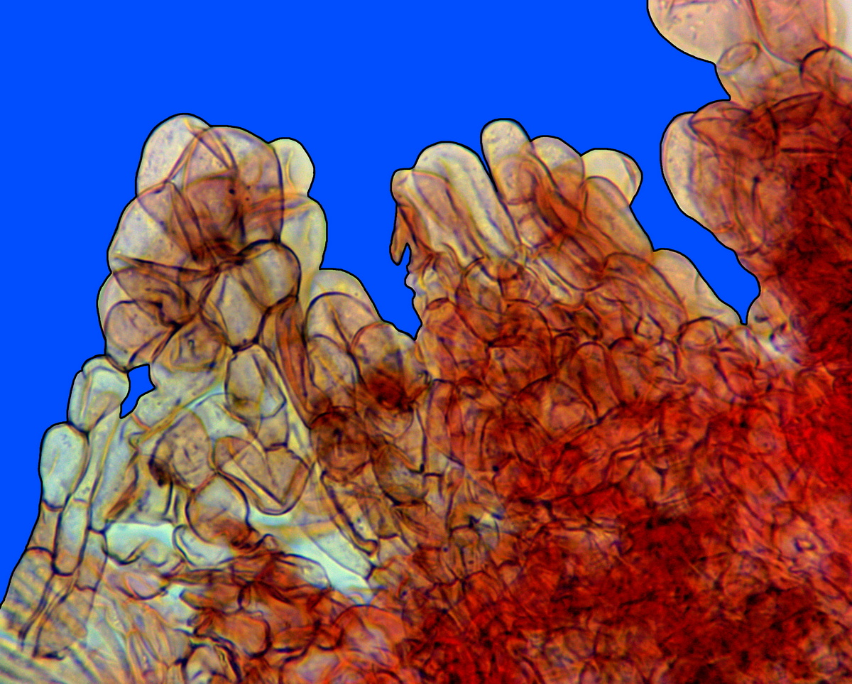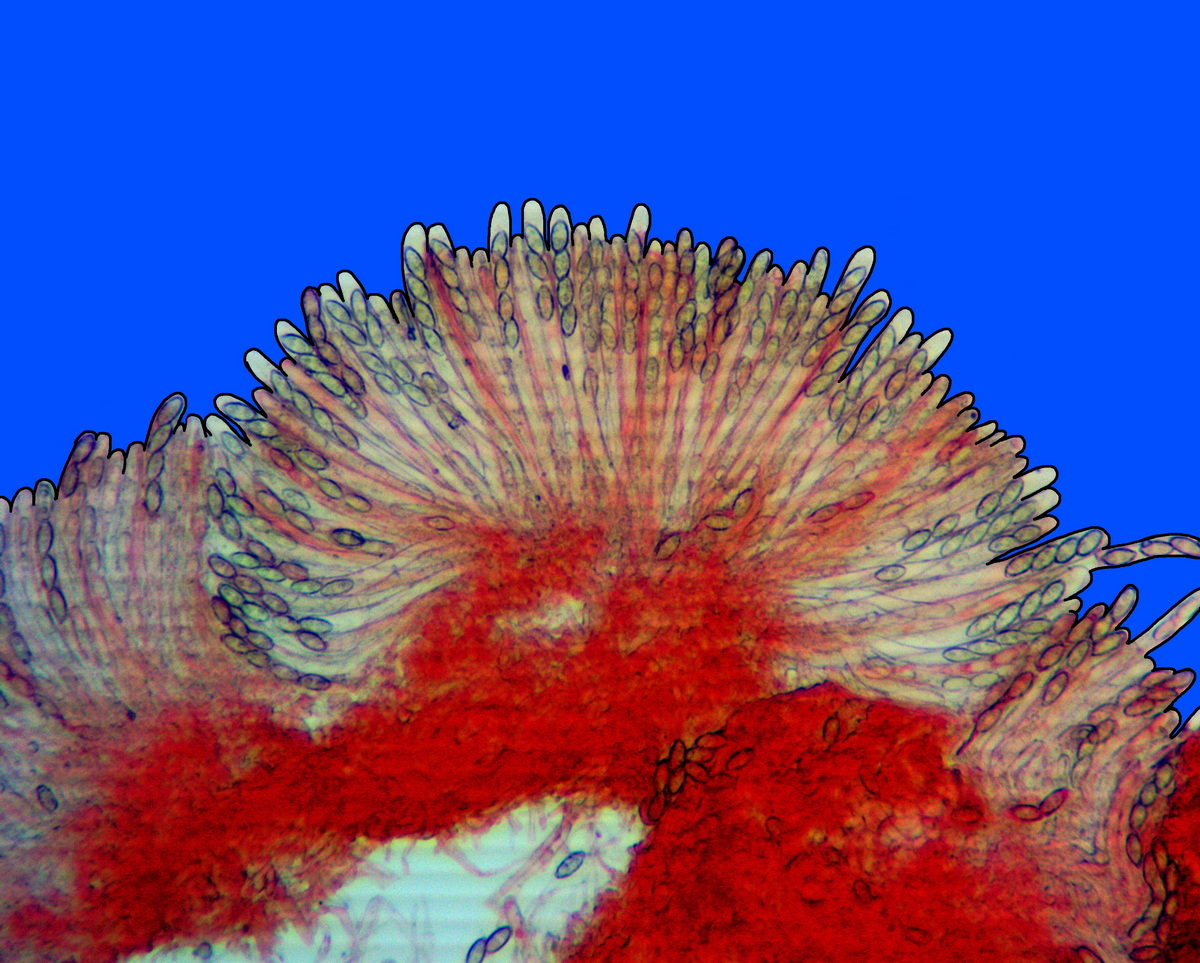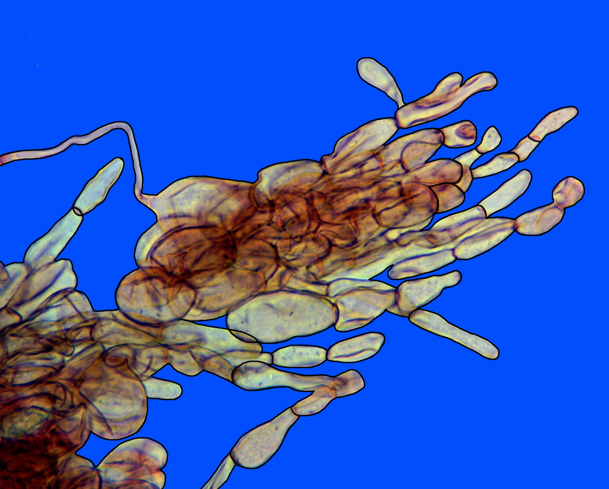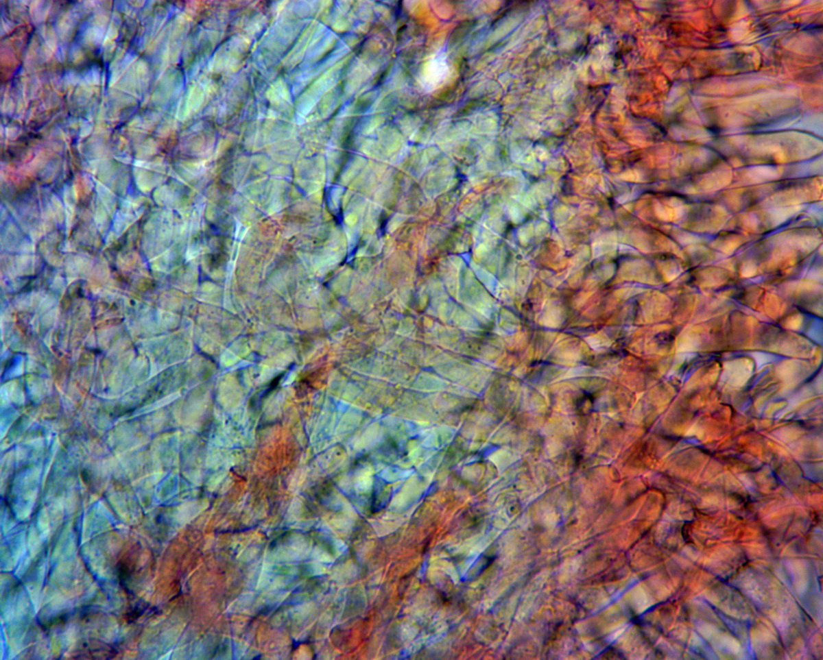 a textura intricata formata da ife larghe (3,37)4,53-7,345-10,78(11,20)µm.